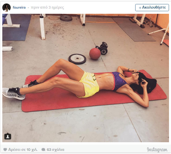 Η ίδια ανέβασε πριν από μερικές ώρες στον λογαριασμό της σε μέσο κοινωνικής δικτύωσης μια φωτογραφία της από την ώρα της άσκησης, στην οποία φορούσε ένα μικροσκοπικό σορτς, και σχολίασε: «40 βαθμοί, καίει το κορμί, η λύση είναι μία, πάω παραλία».