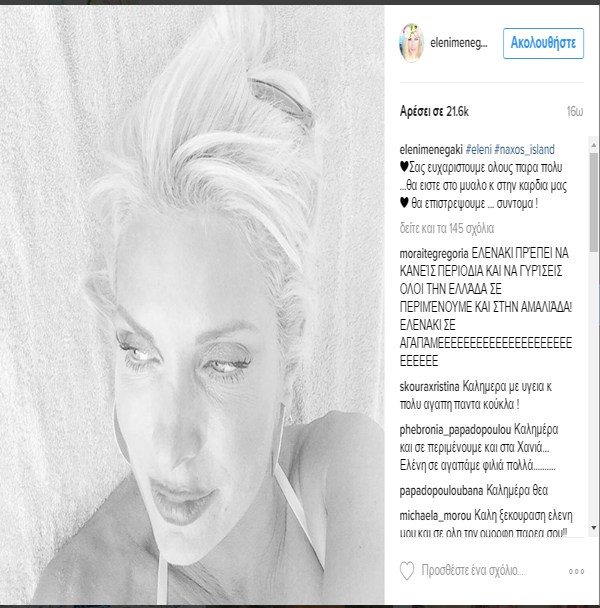Η Ελένη Μενεγάκη όταν βρίσκεται σε mood διακοπών ασχολείται με το κινητό της και τα μέσα κοινωνικής δικτύωσης, ενημερώνοντας τους φίλους της που βρίσκεται και τι κάνει. Σήμερα λοιπόν τους πληροφόρησε για την αναχώρηση της από το αγαπημένο της νησί.