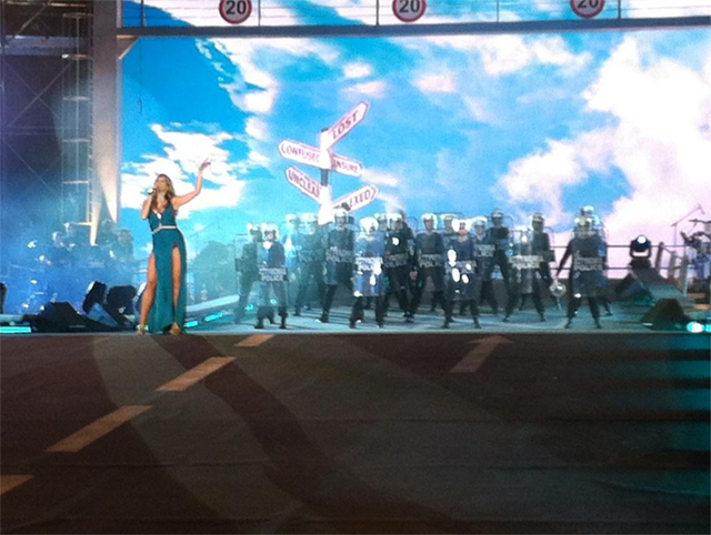 Η Έλλη Κοκκίνου έκανε ανατρεπτική εμφάνιση, αφού από πίσω της είχε τα… ΜΑΤ, να χορεύουν στο ρυθμό των τραγουδιών της.