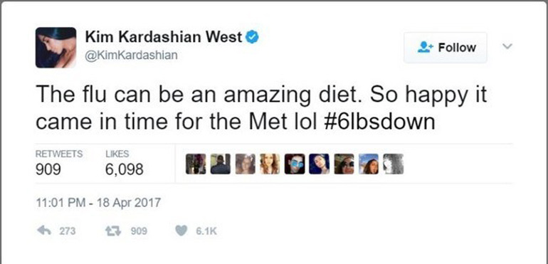 Μια ανάρτηση της Kim Kardashian στο twitter που ανέφερε πως η γρίπη είναι μια «καταπληκτική δίαιτα», ήταν η αφορμή για να προκαλέσει έντονες αντιδράσεις από τους χρήστες.