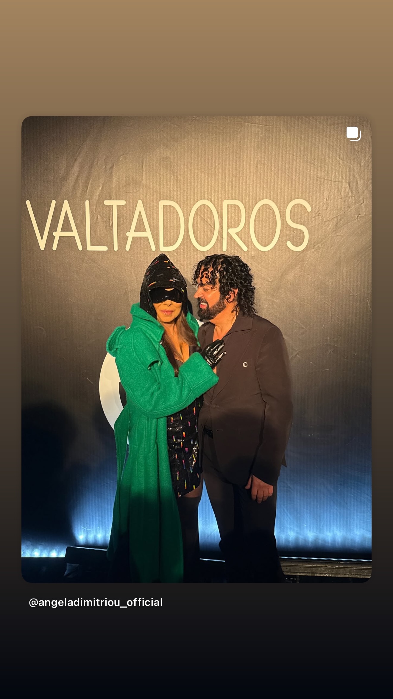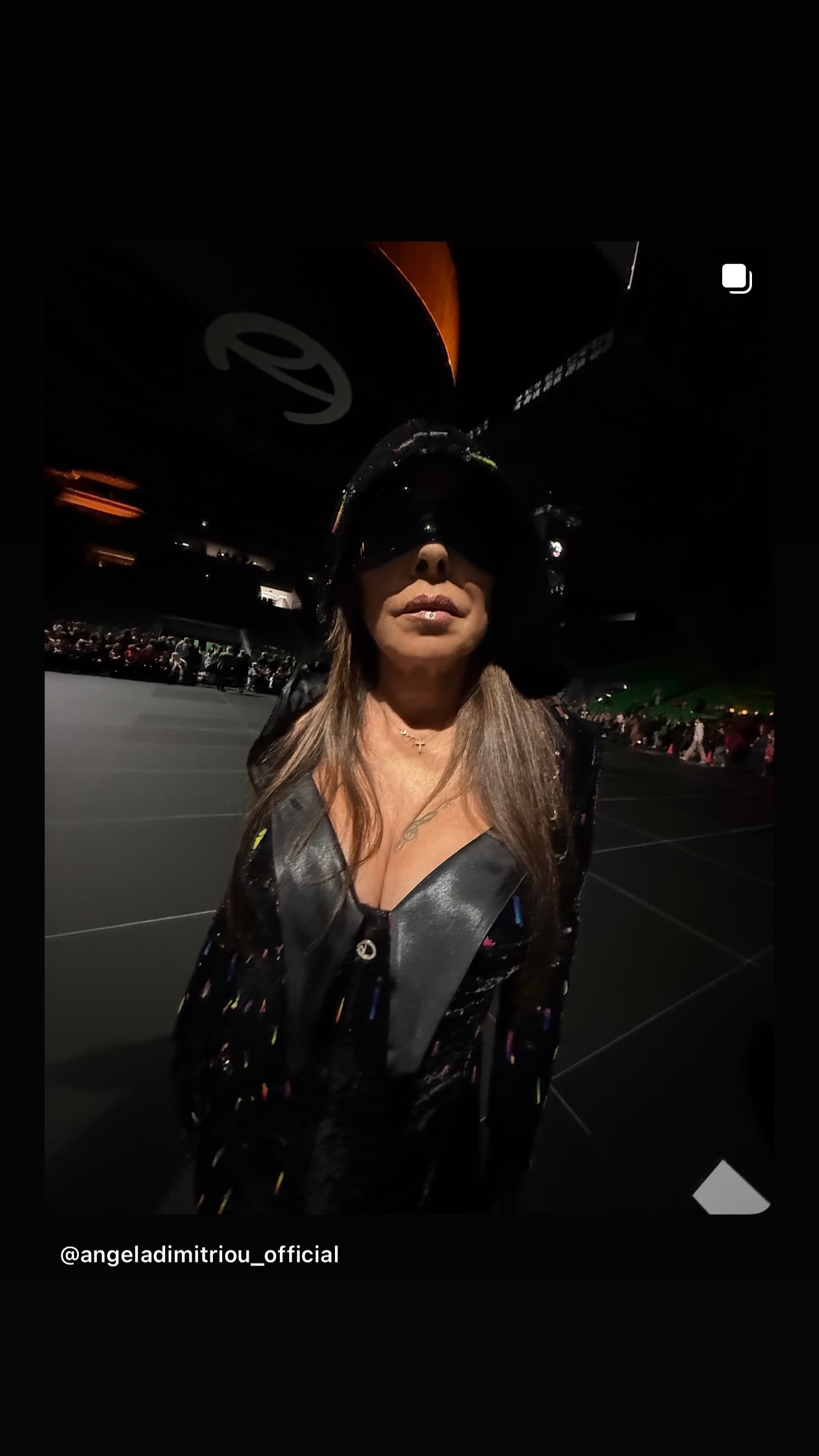Συγκεκριμένα, η Άντζελα Δημητρίου πραγματοποίησε μια εκκεντρική εμφάνιση σε μαύρο και πράσινο ενώ το look της ολοκλήρωσε με κουκούλα και μεγάλα γυαλιά ηλίου.