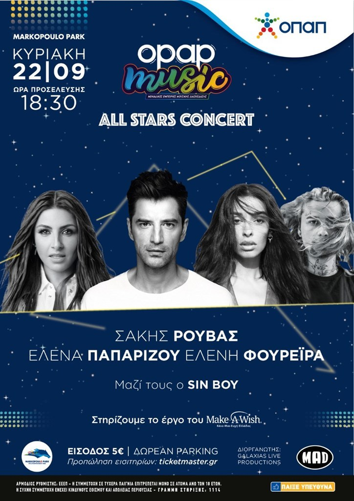 Συναυλία αστέρων από τον ΟΠΑΠ στον Ιππόδρομο Αθηνών στις 22 Σεπτεμβρίου: Σάκης Ρουβάς, Έλενα Παπαρίζου, Ελένη Φουρέιρα & μαζί τους ο Sin Boy – Ξεκίνησε η προπώληση εισιτηρίων
