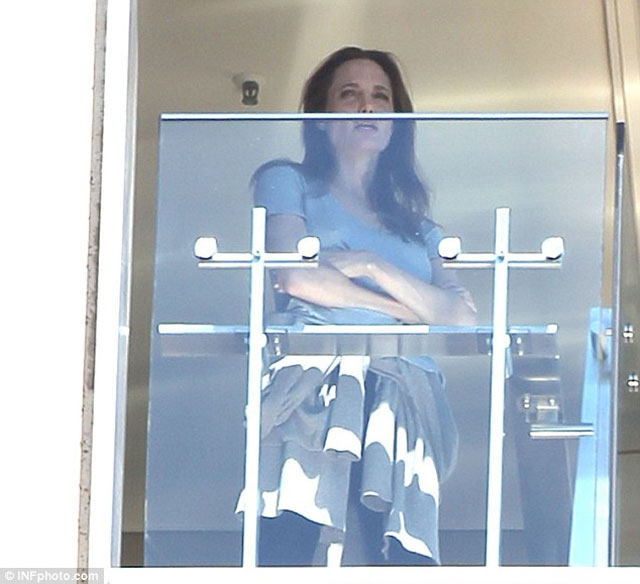 Όπως μπορείτε να δείτε η Τζολί στέκεται στο μπαλκόνι του ξενοδοχείου σε πολύ άσχημη ψυχολογική κατάσταση. Με το κεφάλι σκυμμένο, δείχνει έτοιμη να ξεσπάσει σε κλάματα.