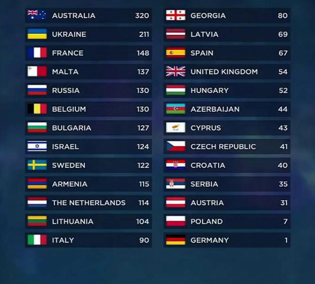 Οι ψήφοι των κριτών και των 42 χωρών: Πρώτη η Αυστραλία, δεύτερη η Ουκρανία και τρίτη η Γαλλία, όταν καταμετρήθηκαν και οι ψήφοι του κοινού η Ουκρανία πέρασε στην πρώτη θέση.