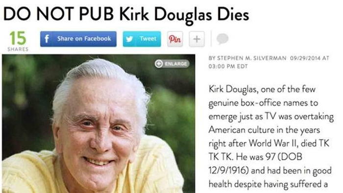 «ΜΗ ΔΗΜΟΣ. Ο Κερκ Ντάγκλας πέθανε» ανέφερε ο τίτλος στη διαδικτυακή έκδοση του περιοδικού «People» και το άρθρο ανέφερε: