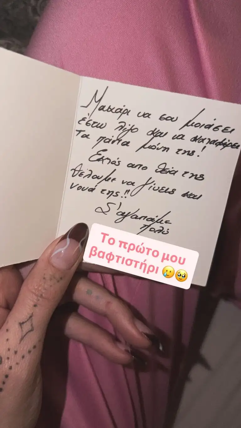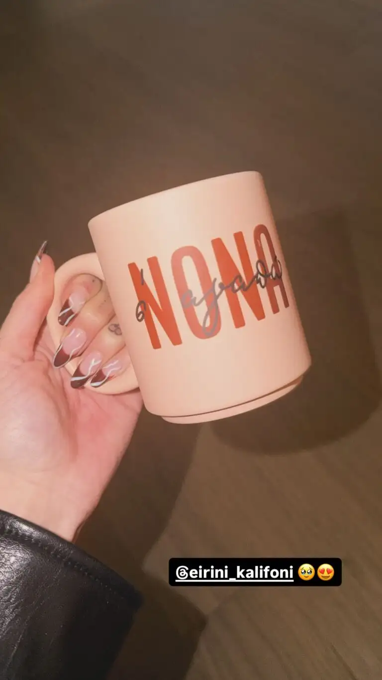 Η Γαρυφαλλιά Καληφώνη δέχτηκε μια κούπα που έγραφε «Νονά, σε αγαπώ» και μια κάρτα που ανέφερε χαρακτηριστικά: «Μακάρι να σου μοιάσει έστω και λίγο, και να καταφέρει τα πάντα μόνη της! Εκτός από θεία της, θέλουμε να γίνεις και νονά της. Σε αγαπάμε πολύ!».