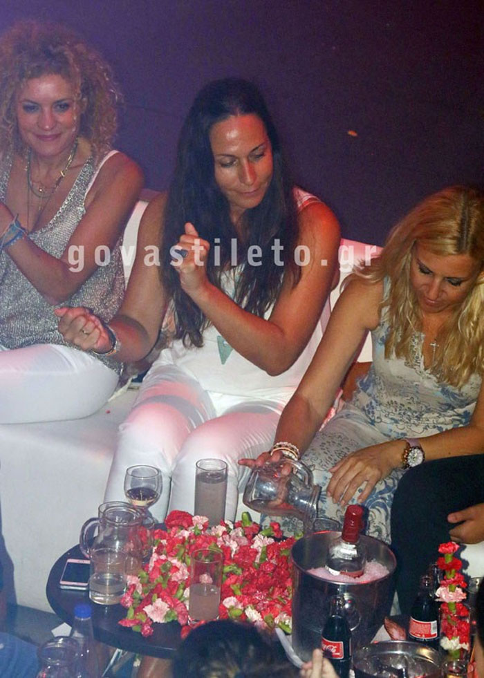 Η όμορφη σύζυγος του τραγουδιστή- φύλακας άγγελός του ντυμένη στα λευκά και μαυρισμένη έκλεψε τις εντυπώσεις με την ομορφιά και την κομψότητά της και διασκέδασε με την παρέα της μέχρι τις πρώτες πρωινές ώρες.