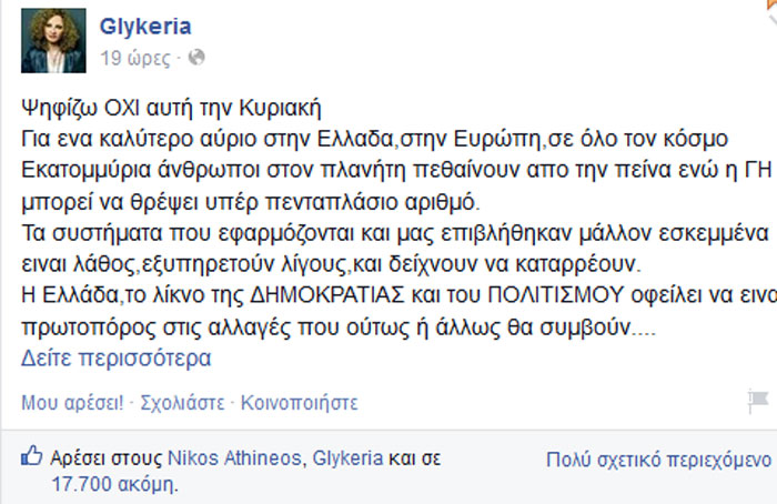 Η Γλυκερία παρακολουθεί όπως κάθε Έλληνας και Ελληνίδα τις πολιτικές εξελίξεις. Η τραγουδίστρια μέσω facebook εξέφρασε την άποψή της για το δημοψήφισμα, αποκαλύπτοντας πως θα ψηφίσει όχι την ερχόμενη Κυριακή.