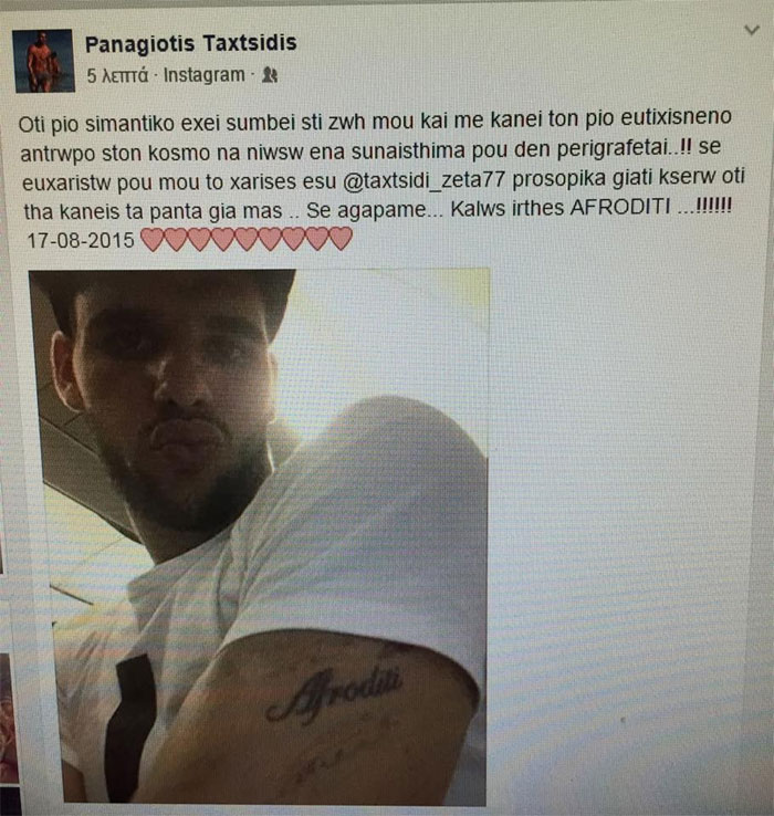«Ότι πιο σημαντικό έχει συμβεί στη ζωή μου και με κάνει τον πιο ευτυχισμένο άνθρωπο στον κόσμο, να νιώσω ένα συναίσθημα που δεν περιγράφεται… Σε ευχαριστώ που μου το χάρισες εσύ Ζέτα προσωπικά γιατί ξέρω ότι θα κάνεις τα πάντα για εμάς… Σε αγαπάμε…Καλώς μας ήρθες Αφροδίτη.17-8-2015», έγραψε ο Παναγιώτης Ταχτσίδης.