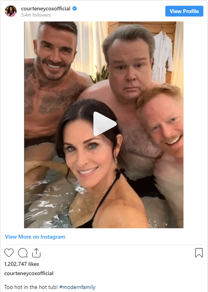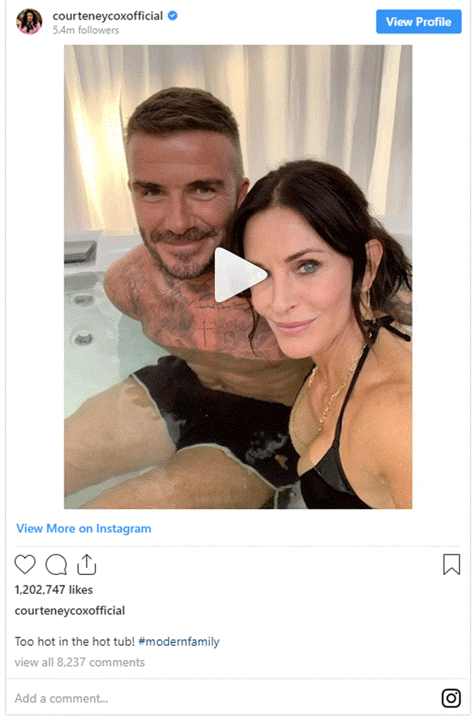 Ο 44χρονος θρύλος του ποδοσφαίρου και η σταρ του Friends, συναντήθηκαν και πόζαραν μαζί καθώς θα συμμετάσχουν στο σίριαλ Modern Family. «Too hot in the hot tub!» έγραψε η Cortney στη φωτογραφία που δημοσίευσε ενώ στη συνέχεια μια ακόμη εικόνα αποκάλυψε πως δεν ήταν μόνοι καθώς στην μπανιέρα ήταν μαζί τους οι σταρ της σειράς Jesse Tyler Ferguson and Eric Stonestreet.