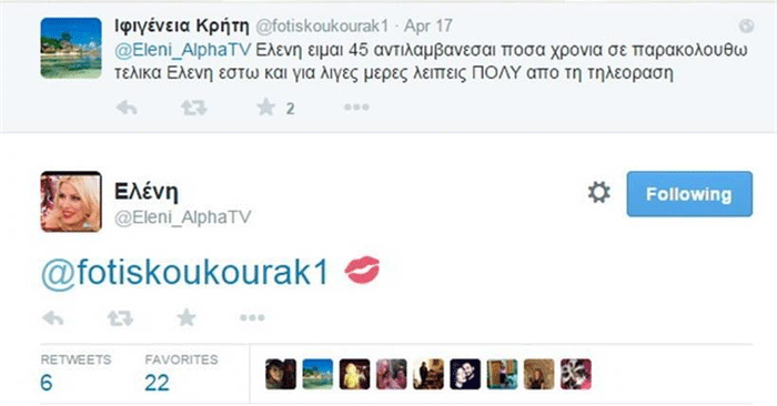 Πέρασαν σχεδόν είκοσι μέρες από τότε, μέχρι που η Ελένη Μενεγάκη έδωσε το στίγμα της στο twitter . Απαντώντας στο σχόλιο μιας διαδικτυακής της φίλης που της εξομολογήθηκε το εξής: «Ελένη, είμαι 45, αντιλαμβάνεσαι πόσα χρόνια σε παρακολουθώ. Τελικά Ελένη, έστω και για λίγες ημέρες μας λείπεις πολύ από την τηλεόραση» και απάντηση της παρουσιάστριας ήταν άμεση στέλνοντας μια καρδιά και ένα φιλί.