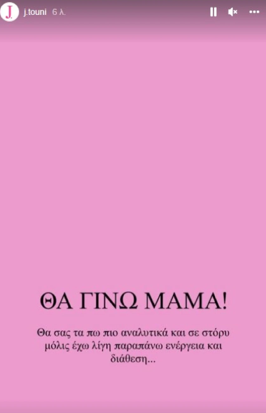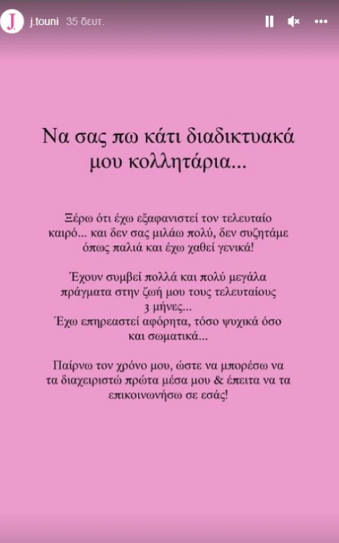 Λίγη ώρα αργότερα η Ιωάννα Τούνη ανέβασε δύο stories στο Instagram, στα οποία ανέφερε τα εξής: