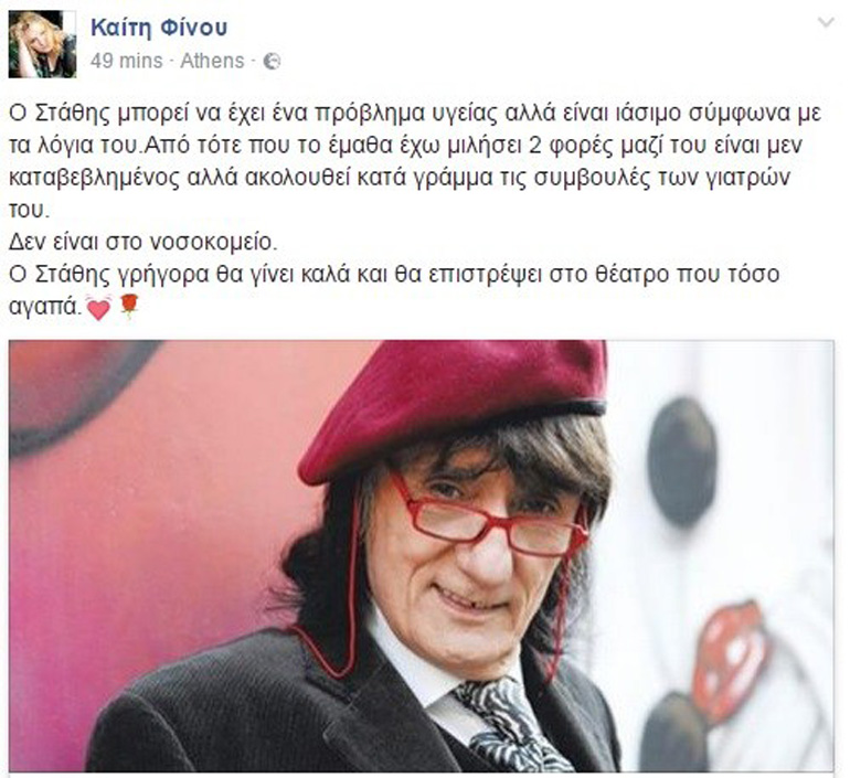Μέσω του προσωπικού της λογαριασμού στο Facebook επέλεξε η Καίτη Φίνου να ενημερώσει φίλους και θαυμαστές του Στάθη Ψάλτη σχετικά με την πορεία της υγείας του.