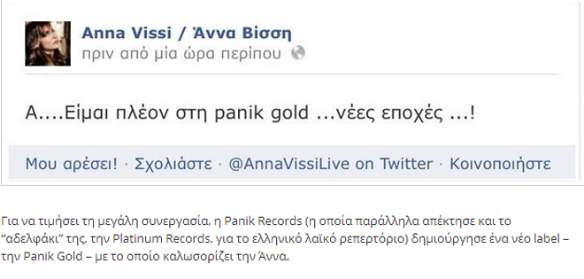 H Άννα Βίσση είναι το νέο μέλος της δισκογραφικής εταιρείας τoυ Πάρι Κασιδόκωστα και του Γιώργου Αρσενάκου, δηλαδή στο δυναμικό της Panik Records, κάτι που το ανακοίνωσε και η ίδια μέσω του Twitter της.