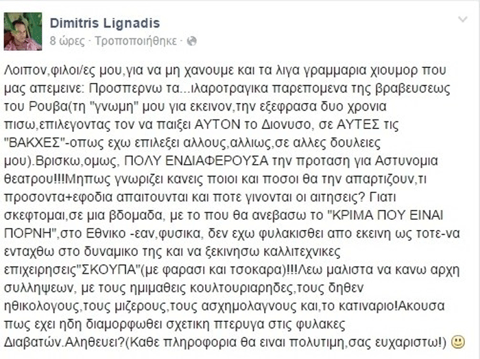 Την δική του απάντηση στη φραστική επίθεση της ηθοποιού και σε όσους άλλους επέκριναν τον Σάκη Ρουβά για τον ρόλο του Διονύσου, έδωσε ο σκηνοθέτης της παράστασης, Δημήτρης Λιγνάδης , με ανάρτησή του στο Facebook, ο κ. Λιγνάδης ξεκαθαρίζει τον λόγο για τον οποίο επέλεξε τον Σάκη για τον συγκεκριμένο ρόλο, ενώ, με πολύ εύστοχο τρόπο, απαντά ότι συμφωνεί με την δημιουργία αστυνομίας θεάτρου.