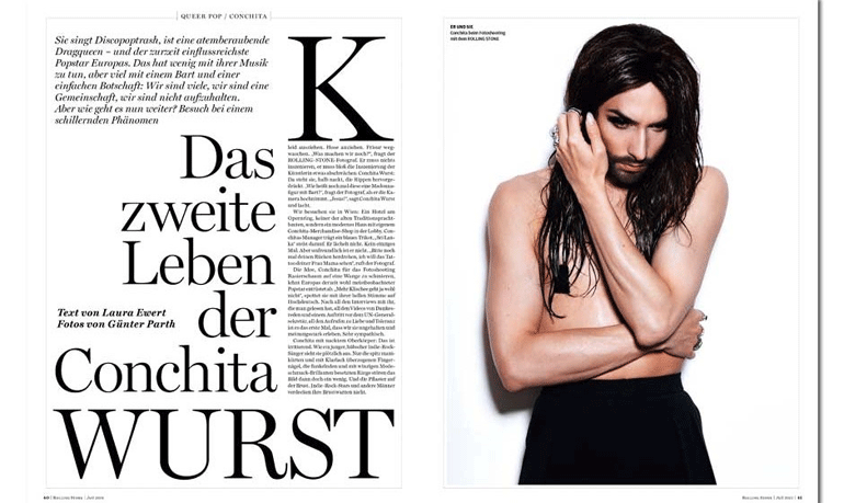 Η περσινή νικήτρια της Eurovision, Conchita Wurst βρίσκει πάντα τρόπους για να κάνει τη διαφορά. Αυτή τη φορά εμφανίστηκε topless -με τις θηλές της να καλύπτονται από stickers- για την Γερμανική έκδοση του απόλυτου μουσικού περιοδικού, Rolling Stone, για το τεύχος Ιουλίου.