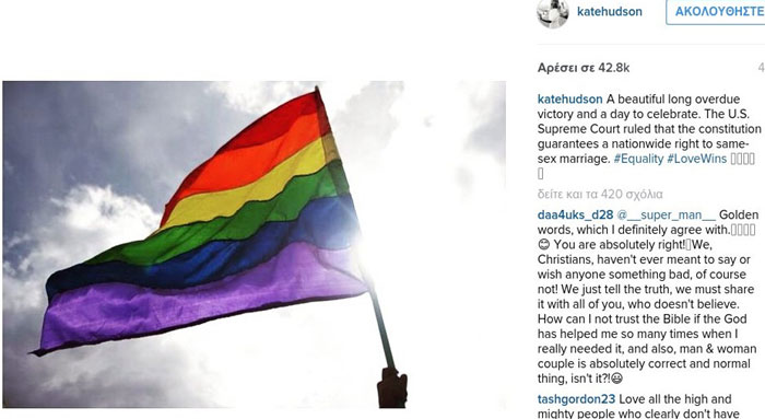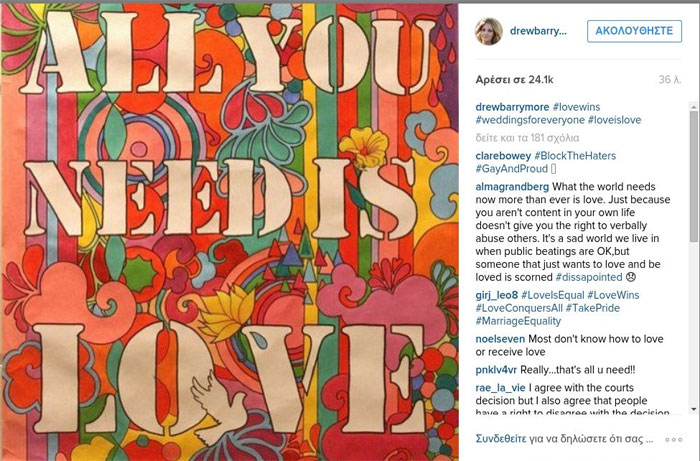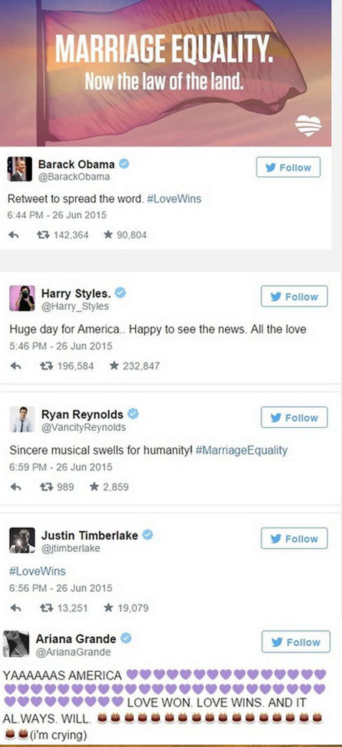 Πολλοί ήταν οι stars που χαιρέτησαν την απόφαση, ανεξαρτήτως σεξουαλικών προτιμήσεων. «Η αγάπη κερδίζει», σχολίασε μεταξύ άλλων ο Barack Obama, ενώ ανάμεσα στους celebrities που έγραψαν θερμά μηνύματα ήταν και οι Lady Gaga, Ryan Reynolds, Harry Styles, Ariana Grande και άλλοι.