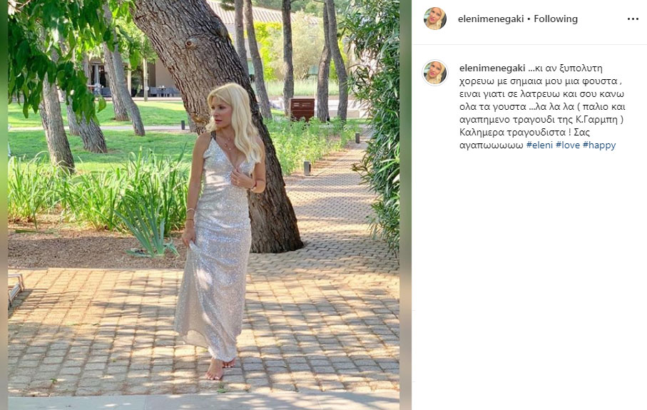«.κι αν ξυπόλυτη χορεύω με σημαία μου μια φούστα , είναι γιατί σε λατρεύω και σου κάνω όλα τα γούστα …λα λα λα ( παλιό και αγαπημένο τραγούδι της Κ.Γαρμπη ) Καλημέρα τραγουδιστά ! Σας αγαπωωωωω», έγραψε χαρακτηριστικά η Ελένη Μενεγάκη.