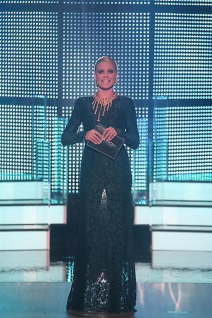 Η πρώτη εμφάνισή της ήταν ξεχωριστή: η παρουσιάστρια του σόου επέλεξε ένα φόρεμα Celia Kritharioti Haute Couture με βαθύ ντεκολτέ.