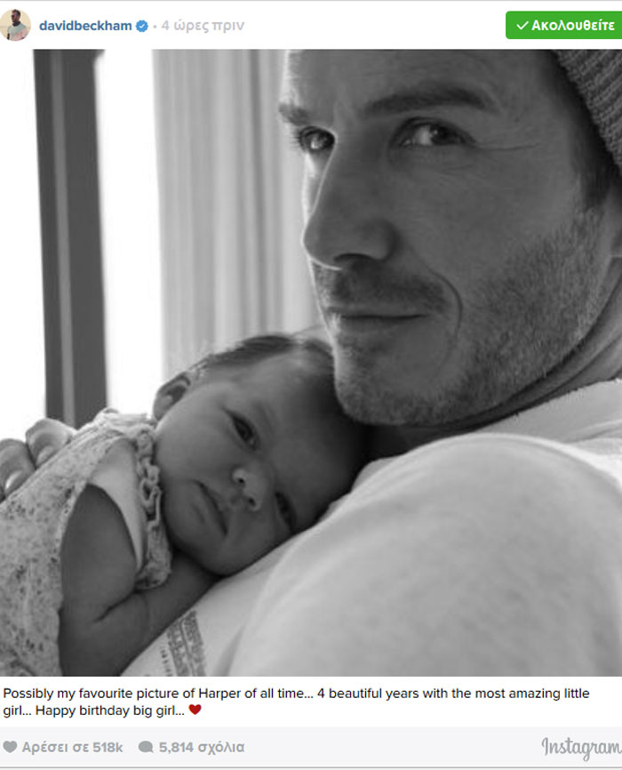 Ο David Beckham αφού ανέβασε μία πολύ τρυφερή φωτογραφία τους, έγραψε: «Είναι μάλλον η αγαπημένη μου φωτογραφία με τη Harper μέχρι σήμερα. 4 όμορφα χρόνια με το πιο εκλπληκτικό κοριτσάκι! Χρόνια πολλά μεγάλο μου κορίτσι! Σε αγαπώ».