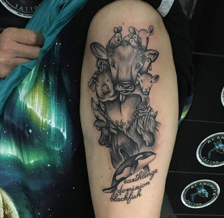 «Έκανα πρόσφατα και σε διάστημα οκτώ μηνών τρία τατουάζ, ενώ θα ακολουθήσουν κι άλλα. Το πρώτο τατουάζ έγραφε animal liberation vegan (απελευθέρωση των ζώων, vegan). Το δεύτερο, το οποίο έχει και η μικρή μου κόρη στο χέρι της, απεικονίζει μια λύκαινα με το λυκάκι της. Το τρίτο και πιο πρόσφατο απεικονίζει όλα τα ζώα της φάρμας που εκμεταλλευόμαστε, αλλά και άγρια ζώα, όπως ο ταύρος, η αλεπού αλλά και η όρκα.