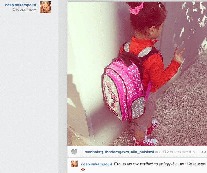 Η ευτυχισμένη μανούλα μοιράστηκε το πρωί της Τρίτης 19 Μαΐου ένα όμορφο στιγμιότυπο με την μονάκριβη κόρη της την ώρα που πήγαινε στο σχολείο. «Έτοιμο για τον παιδικό το μαθητριάκι μου! Καλημέρα!» έγραψε στη λεζάντα της φωτογραφίας η Δέσποινα Καμπούρη.