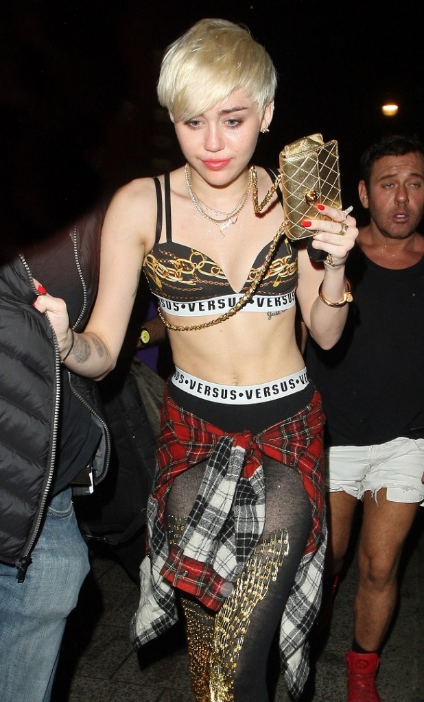 Η εμφάνισή της όμως αυτή σχολιάστηκε όχι μόνο για την κατάσταση μέθης στην οποία είχε περιέλθει. Η Cyrus ήταν ντυμένη κακόγουστα: φορούσε για μπλούζα ένα… σουτιέν το οποίο είχε συνδυάσει με καυτό σορτς, ένα καλσόν διακοσμημένο με παραμάνες και πέδιλα!