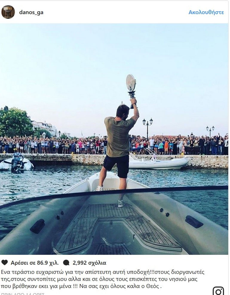 «Ένα τεράστιο ευχαριστώ για την απίστευτη αυτή υποδοχή!!! Στους διοργανωτές της, στους συντοπίτες μου αλλά και σε όλους τους επισκέπτες του νησιού μας που βρέθηκαν εκεί για μένα !!! Να σας έχει όλους καλά ο Θεός» έγραψε ο Ντάνος, αναρτώντας μια φωτογραφία του από το λιμάνι.