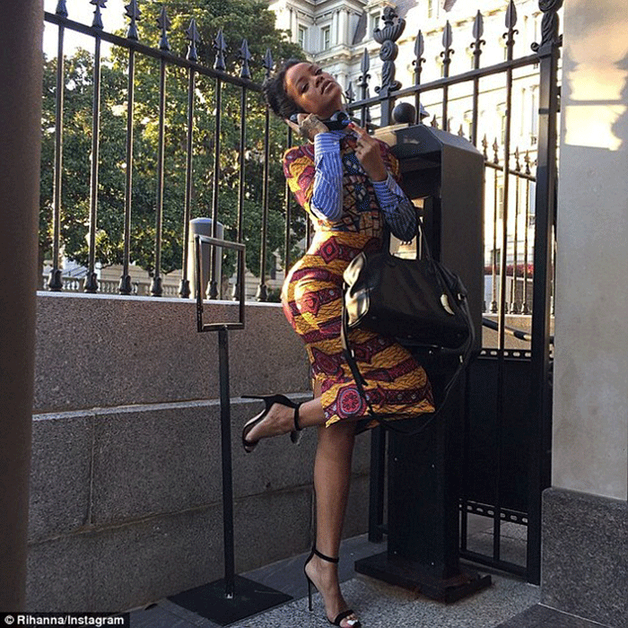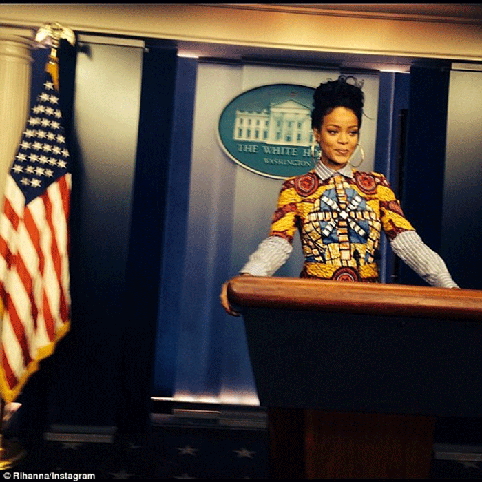 Η Ριάνα ανέβηκε στο πόντιουμ όπου ο κυβερνητικός εκπρόσωπος, δίπλα στο Οβάλ Γραφείο του αμερικανού προέδρου, κάνει την καθημερινή ενημέρωση των πολιτικών συντακτών.