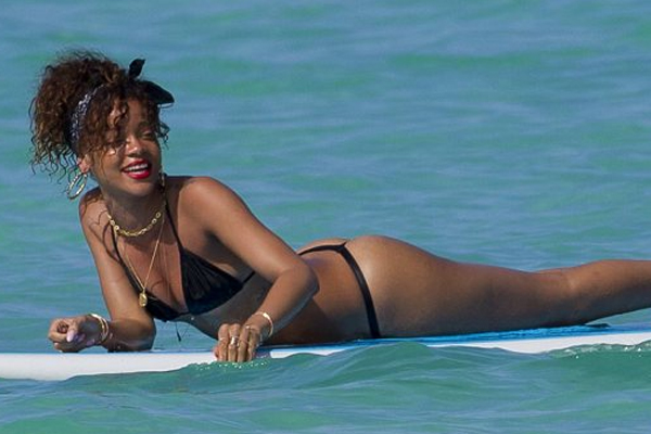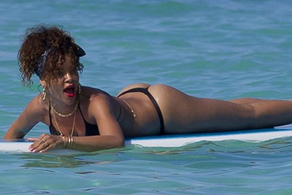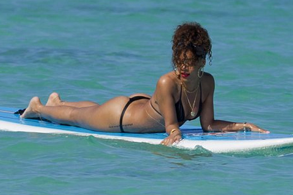 Η Rihanna φόρεσε λοιπόν ένα μαύρο string μαγιό και απόλαυσε τον ήλιο της Χαβάης κάνοντας ηλιοθεραπεία στη θάλασσα, πάνω σε μια σανίδα του surf.