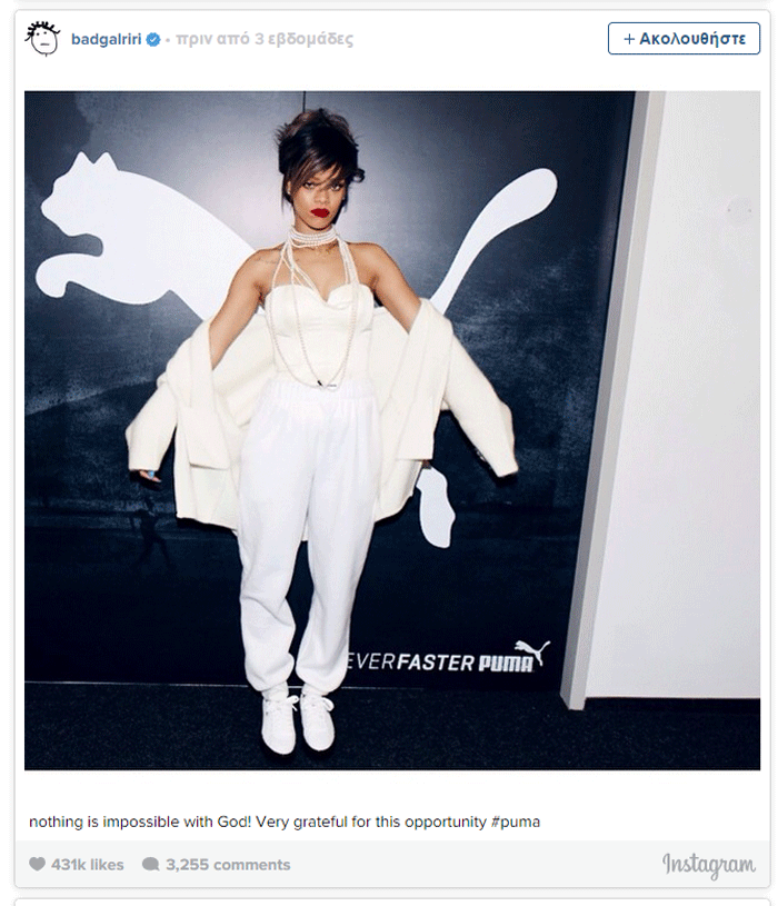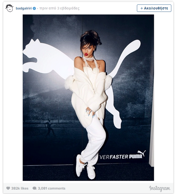 Έτσι, η Riri πήρε το…χρίσμα της creative director αλλά και ambassador της εταιρείας Puma, έχοντας την επίβλεψη της γυναικείας γραμμής ρούχων! Φυσικά η τραγουδίστρια θα είναι και το κεντρικό πρόσωπο της καμπάνιας της Puma, με την ίδια να μας δίνει ήδη τα πρώτα δείγματα στο instagram!