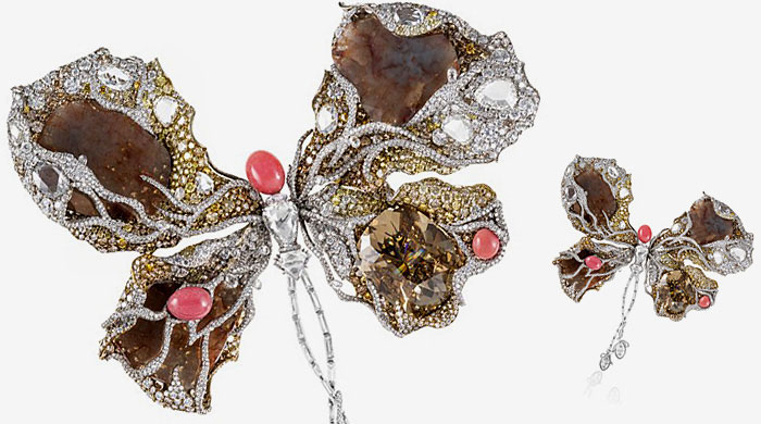 Το κόσμημα, σε σχήμα πεταλούδας, χρειάστηκε δύο χρόνια μέχρι να ολοκληρωθεί, και αποτελείται από καφέ διαμάντια 27 καρατίων, τα οποία πλαισιώνουν μικρότερα μπριγιάν και άγρια μαργαριτάρια.