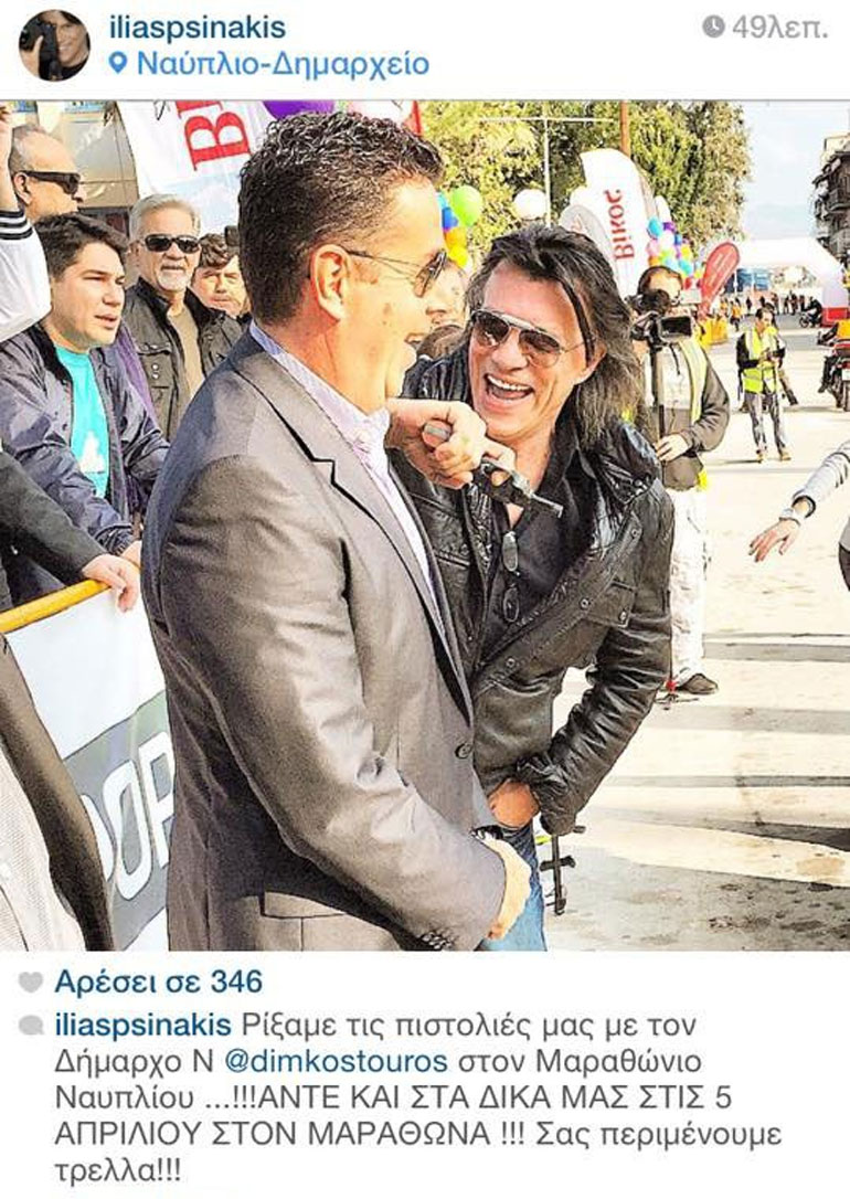 Αφού ανέβασε την παρακάτω φωτογραφία όπου τον βλέπουμε να κρατάει ένα πιστόλι και να ποζάρει δίπλα στον δήμαρχο Ναυπλίου Δημήτρη Κωστόρου, σχολίασε: «Ρίξαμε τις πιστολιές μας με τον Δήμαρχο Ναυπλίου στον Μαραθώνιο Ναυπλίου…!!!Άντε και στα δικά μας στις 5 Απριλίου στον Μαραθώνα!!! Σας περιμένουμε με τρέλα!!!» .