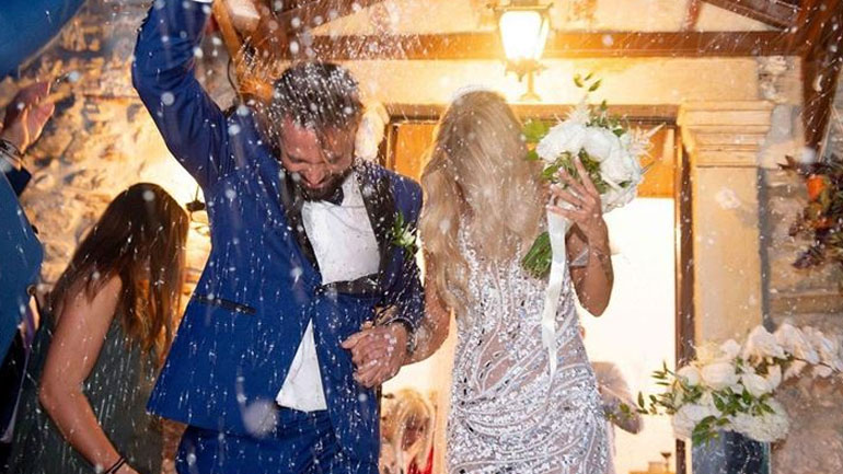 Το ζευγάρι ενώθηκε με τα ιερά δεσμά του γάμου στον Ιερό Ναό του Αγίου Νικολάου στην Κύμη, έχοντας στο πλευρό τους μόνο στενούς φίλους και συγγενείς.