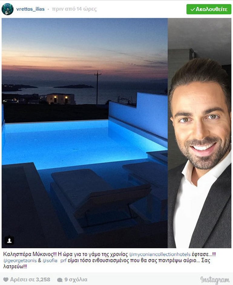 Στη Μύκονο βρίσκεται αυτό το Σαββατοκύριακο ο Ηλίας Βρεττός, μιας και το Σάββατο πρόκειται να γίνεικουμπάρος στον γάμο του παιδικού του φίλου, Γιώργου Τζώνη και της εκλεκτής της καρδιάς του, Σοφίας. «Καλησπέρα Μύκονος!!! Η ώρα για το γάμο της χρονιάς έφτασε», έγραψε ο λαϊκός τραγουδιστής και μοιράστηκε αυτή τη φωτογραφία με τους διαδικτυακούς του φίλους.