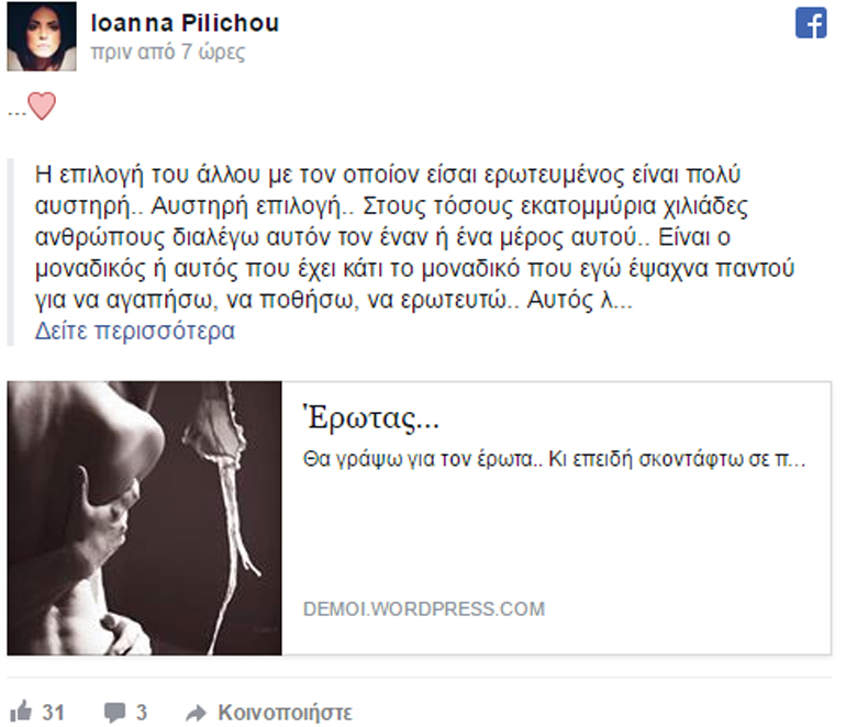 Χθες η ηθοποιός με ανάρτησή της στο facebook δήλωσε για μια ακόμα φορά τον μεγάλο της έρωτα για τον σύντροφό της: «Η επιλογή του άλλου με τον οποίον είσαι ερωτευμένος είναι πολύ αυστηρή.. Αυστηρή επιλογή.. Στους τόσους εκατομμύρια χιλιάδες ανθρώπους διαλέγω αυτόν τον έναν ή ένα μέρος αυτού.. Είναι ο μοναδικός ή αυτός που έχει κάτι το μοναδικό που εγώ έψαχνα παντού για να αγαπήσω, να ποθήσω, να ερωτευτώ.. Αυτός λοιπόν είναι ο πόθος μου.. Αυτός αυτοπροσώπως.. Βρήκα το άλλο μου μισό».