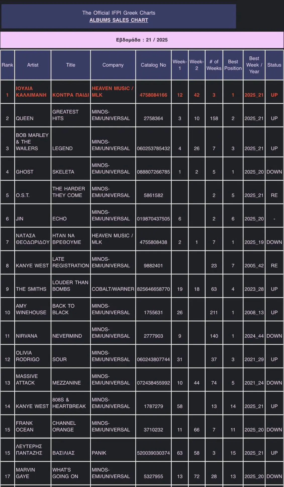 Δεν υπάρχει μεγαλύτερη επιβράβευση για έναν καλλιτέχνη και την ομάδα του, να βλέπει την δουλειά του, να κατακτάει την πρώτη θέση, στην αγάπη του κόσμου, και κατά προέκταση και στην λίστα του Official IFPΙ Charts, αφήνοντας πίσω του, τα μεγαλύτερα ονόματα της ελληνικής αλλά και της διεθνούς μουσικής σκηνής.
