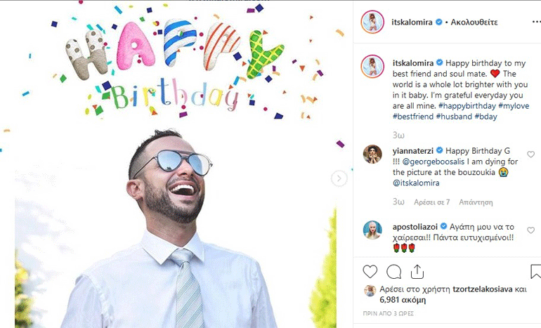 Τα γενέθλιά του είχε την Τετάρτη ο σύζυγος της Καλομοίρας, Γιώργος Μπούσαλης, και η αγαπημένη του θέλησε να του ευχηθεί και δημόσια «Χρόνια πολλά».