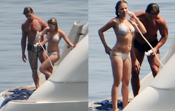 Όπως φαίνεται και στις φωτογραφίες που ακολουθούν, δεν κάνει τίποτε άλλο από το να ακολουθεί τη διάσημη σεξοβόμβα σε κάθε της βήμα, την ίδια στιγμή που η ηθοποιός φροντίζει να αναδεικνύει τα πλούσια κάλλη της με ένα λευκό μπικίνι.