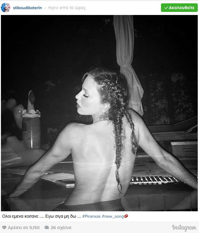 «Όλοι εμένα κοιτάνε ….Εγώ σιγά μη δω …. #Piranxas# νέο τραγούδι», έγραψε στη λεζάντα του σέξι στιγμιότυπου.