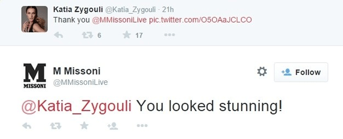 «Υπέροχη» έγραψε ο ιταλικός οίκος μόδας και αναδημοσίευσε στον λογαριασμό του στο Twitter την φωτογραφία της Κάτιας, ενώ, όταν η Κάτια ευχαρίστησε τον οίκο, που της απάντησε ξανά, χαρακτηρίζοντάς την «εκθαμβωτική»!