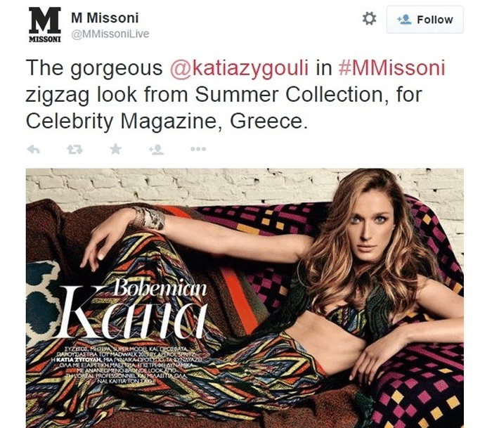 Η Κάτια Ζυγούλη πόζαρε πριν λίγες μέρες για το περιοδικό «Celebrity» με bohemian στιλ και η φωτογραφία που ανέβασε το μοντέλο στον λογαριασμό του στο instagram συγκέντρωσε εκτός από χιλιάδες likes και τα κολακευτικά σχόλια του οίκου «Μ Missoni», δημιουργία του οποίου φοράει το μοντέλο στην παρακάτω φωτογραφία.