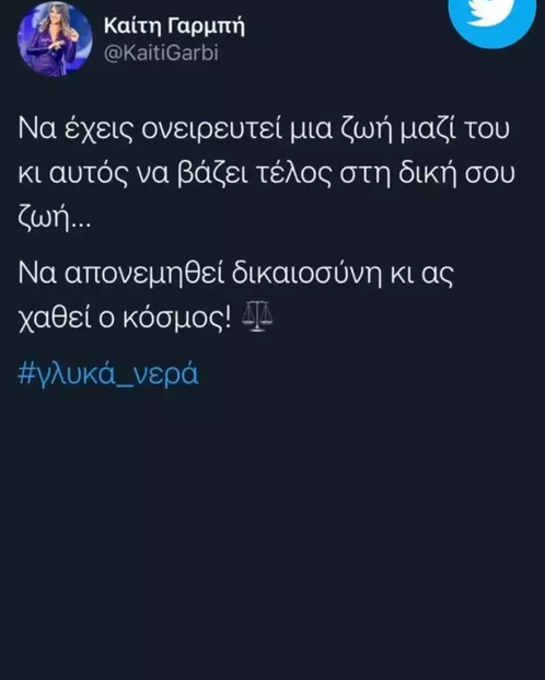 Ανάμεσα σε εκείνους που αντέδρασαν είναι και η Καίτη Γαρμπή που μέσα από τον λογαριασμό της στο Twitter έγραψε: «Να έχεις ονειρευτεί μια ζωή μαζί του και αυτός να βάζει τέλος στη δική σου ζωή… Να απονεμηθεί δικαιοσύνη και ας χαθεί ο κόσμος”».
