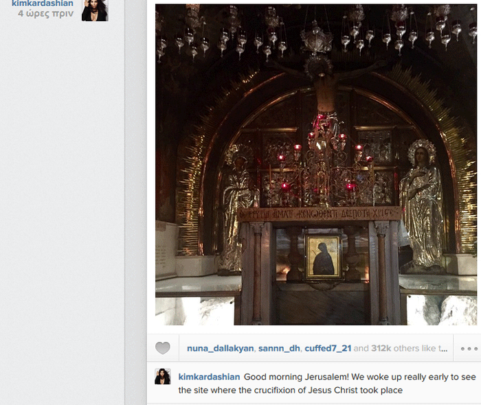 Μετά από πέντε ημέρες στην Αρμενία, η Kim Kardashian, o Kanye West και η κόρη τους North αποφάσισαν να ταξιδέψουν στα Ιεροσόλυμα και να πραγματοποιήσουν εκεί τη βάφτιση της μικρής. Η οικογένεια έφτασε το πρωί της Δευτέρας στον καθεδρικό ναό του St. James στην παλιά πόλη της Ιερουσαλήμ και σήμερα Τρίτη 14 Απριλίου η τηλεπερσόνα όπως μας έδειξε μέσα από φωτογραφίες που ανέβασε στον λογαριασμό της στο instagram βρέθηκε μαζί με τον Kanye West στο μέρος όπου σταυρώθηκε ο Χριστός.