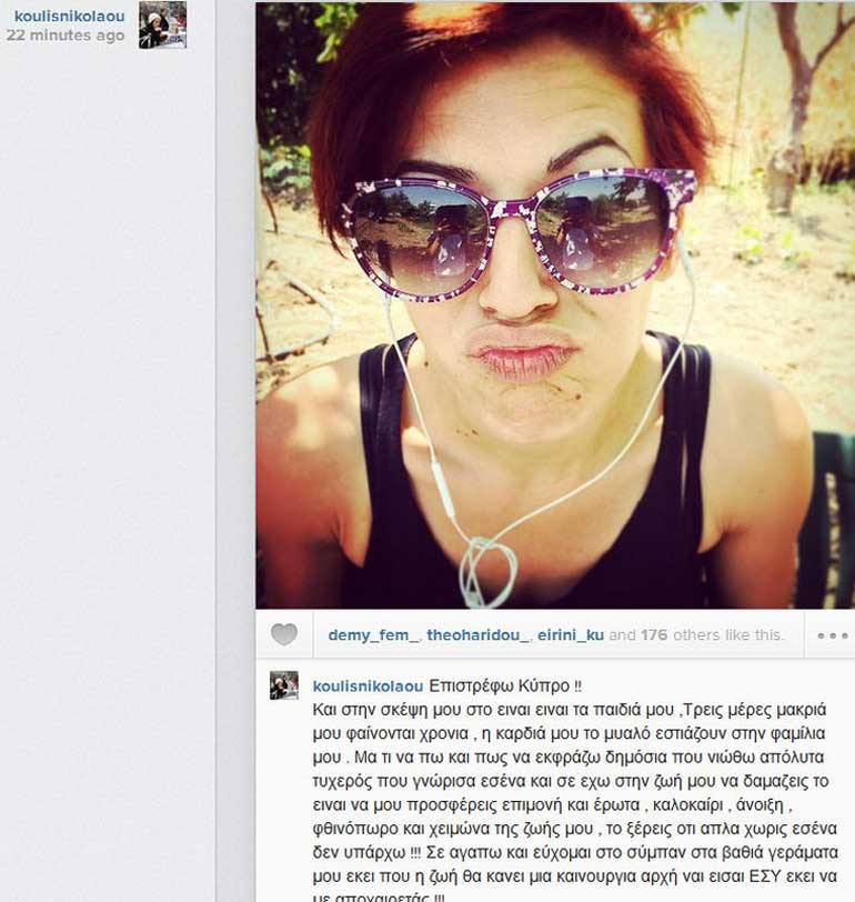 Ο ηθοποιός αφού δημοσίευσε μία φωτογραφία της συζύγου στο instagram δε δίστασε να της κάνει δημόσια ερωτική εξομολόγηση. «Επιστρέφω Κύπρο !! Και στην σκέψη μου στο είναι τα παιδιά μου. Τρεις μέρες μακριά μου φαίνονται χρόνια, η καρδιά μου το μυαλό εστιάζουν στην φαμίλια μου. Μα τι να πω και πως να εκφράζω δημόσια που νιώθω απόλυτα τυχερός που γνώρισα εσένα και σε εχω στην ζωή μου να δαμάζεις το είναι να μου προσφέρεις επιμονή και έρωτα , καλοκαίρι, άνοιξη, φθινόπωρο και χειμώνα της ζωής μου, το ξέρεις ότι απλά χωρίς εσένα δεν υπάρχω !!! Σε αγαπώ και εύχομαι στο σύμπαν στα βαθιά γεράματα μου εκεί που η ζωή θα κάνει μια καινούργια αρχή ναι είσαι ΕΣΥ εκεί να με αποχαιρετάς !!!», έγραψε.