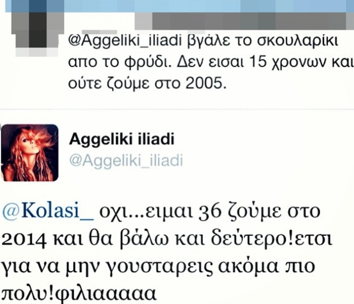 H Αγγελική όταν το είδε έσπευσε να της απαντήσει καταλλήλως: «Όχι είμαι 36 και ζούμε στο 2014 και θα βάλω και δεύτερο. Έτσι για να μην γουστάρεις ακόμα πιο πολύ! φιλιάααα» και πρόσθεσε: «Κακό και αντιδραστικό κορίτσι είμαι να το ξέρετε»!