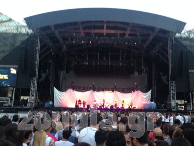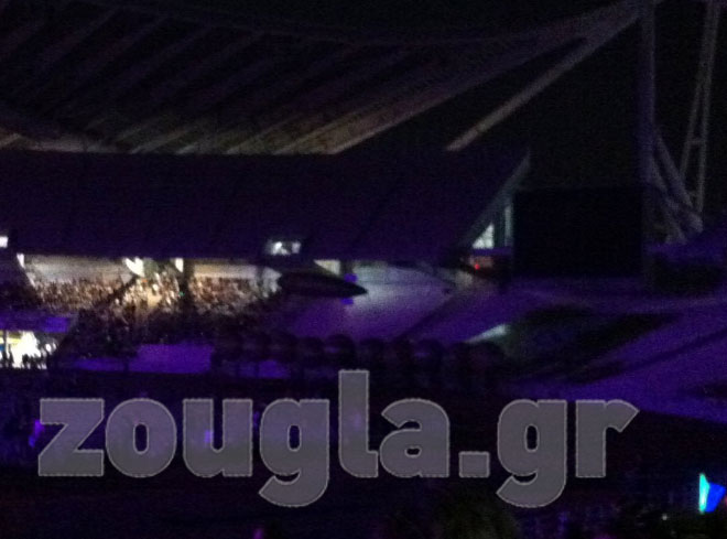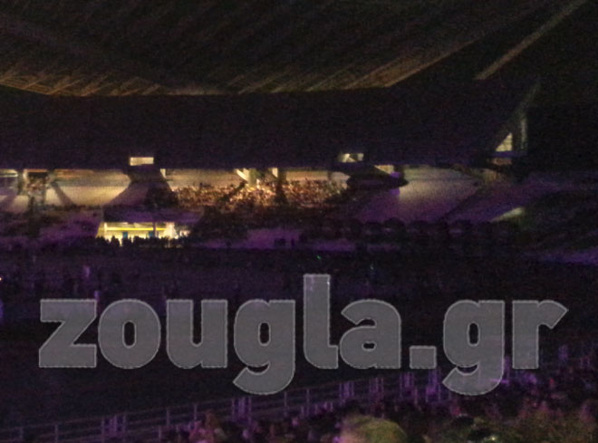 H Lady Gaga βγήκε στη σκηνή φορώντας χρυσό φόρεμα με φτερά-πλοκάμια, συνοδεία δύο υψηλόσωμων χορευτών και είπε στο κοινό: «Σας αγαπώ…, ευχαριστώ Athens».