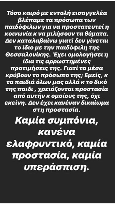 «Τόσο καιρό με εντολή εισαγγελέα βλέπαμε τα πρόσωπα των παιδόφιλων για να προστατευτεί η κοινωνία και να μιλήσουν τα θύματα. Δεν καταλαβαίνω γιατί δεν γίνεται το ίδιο με την παιδόφιλη της Θεσσαλονίκης. Έχει ομολογήσει η ίδια τις αρρωστημένες προτιμήσεις της. Γιατί τα μέσα κρύβουν το πρόσωπό της; Εμείς και τα παιδιά όλων μας χρειάζονται προστασία από αυτήν και τους ομοίους της, όχι εκείνη. Δεν έχει κανένα δικαίωμα στην προστασία. Καμία συμπόνοια, κανένα ελαφρυντικό, καμιά προστασία, καμιά υπεράσπιση» ξέσπασε η Ελεονώρα Μελέτη.
