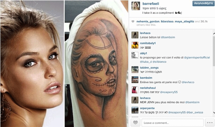 Όπως μπορείτε να δείτε ο fan του μοντέλου αποτύπωσε στο μπράτσο του το πρόσωπό της σε μία, όμως, πιο gothic μορφή! «Το παίρνω σαν κομπλιμέντο» σχολίασε στη λεζάντα της φωτογραφίας η Ρεφαέλι.