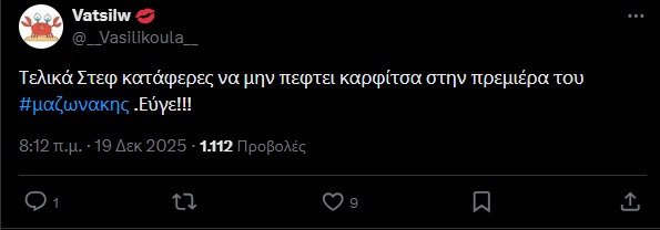 Η πρεμιέρα του Γιώργου Μαζωνάκη σχολιάστηκε στις εκπομπές και στα social media. Μέσα από το X το κοινό για άλλη μια φορά στήριξε τον δημοφιλή τραγουδιστή, με τις εμφανίσεις του να είναι sold out.